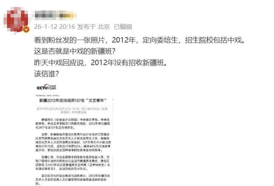 最近这事儿闹得真不小,闫学晶原本道个歉,大家以为就翻篇了,结果越扒越深,连她儿子上学的事都被翻出来反复查。有博主实名举报,说她儿子当年靠“新疆班”进的中戏,可人家明明是北京户口、汉族身份,压根不符合政策条件。中戏倒是发了声明,说林傲霏是以北京生源正常录取,还强调那年根本没招所谓“新疆班”。可网友不买账,又找出他和新疆同学的合影,怀疑占了定向名额——这事真假难辨,但舆论已经刹不住车了。